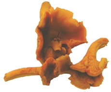 The rather short, firm-fleshed stem of the chanterelle gives way to the cap. At the start of its growth, this is dome-shaped and the edge is rolled. Later the cap becomes deeper, taking on a funnel-like shape, and the edge becomes rippled, curling downward. The surface is smooth and matte, not shiny. The gills run from the edge of the cap far down the stem. The bright yellow to red-yellow of the chanterelle is particularly conspicuous.